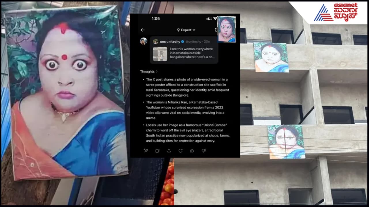 ಕರ್ನಾಟಕದಾದ್ಯಂತ ಕಟ್ಟಡಗಳು ಮತ್ತು ಹೊಲಗಳಲ್ಲಿ ದೃಷ್ಟಿ ಗೊಂಬೆಯಾಗಿ ಬಳಸಲಾಗುತ್ತಿರುವ ದೊಡ್ಡ ಕಣ್ಣುಗಳ ಮಹಿಳೆಯ ಫೋಟೋ ವೈರಲ್ ಆಗಿದೆ. ಈಕೆ ಯೂಟ್ಯೂಬರ್ ನಿಹಾರಿಕಾ ರಾವ್ ಎಂದು ಹೇಳಲಾಗುತ್ತಿದೆಯಾದರೂ, ಈಕೆಯ ನಿಜವಾದ ಗುರುತು ಮತ್ತು ಫೋಟೋದ ಹಿಂದಿನ ಸತ್ಯ ಇನ್ನೂ ನಿಗೂಢವಾಗಿಯೇ ಉಳಿದಿದೆ.