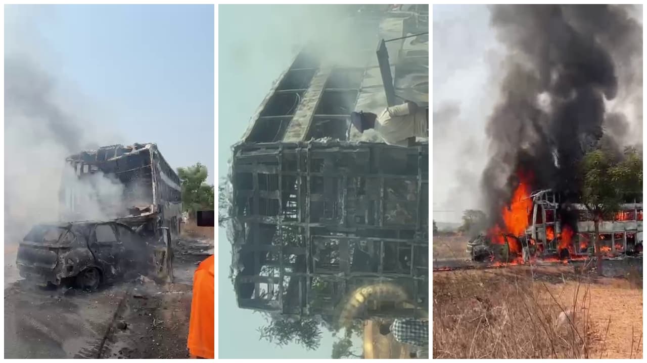 ಅಪಘಾತದ ಹೊಡೆತಕ್ಕೆ ಬಸ್ಗೂ ಬೆಂಕಿ ತಗುಲಿದ್ದು, ಕೆಲ ಪ್ರಯಾಣಿಕರಿಗೆ ಗಂಭೀರ ಗಾಯಗಳಾಗಿವೆ ಎಂದು ತಿಳಿದು ಬಂದಿದೆ. ಸ್ಥಳೀಯರು ಹಾಗೂ ತಕ್ಷಣ ಆಗಮಿಸಿ ಕಾರಿನಲ್ಲಿದ್ದವರನ್ನು ರಕ್ಷಿಸಲು ಮುಂದಾದರು. ಆದರೆ ಕಾರು ಅಪ್ಪಚ್ಚಿಯಾಗಿ ಡೋರ್ ಓಪನ್ ಆಗಲೇ ಇಲ್ಲ. ನೋಡ ನೋಡುತ್ತಿದ್ದಂತೆಯೇ ಬೆಂಕಿ ಹರಡಿತು. ಅಗ್ನಿಶಾಮಕ ದಳದ ಸಿಬ್ಬಂದಿ ಬೆಂಕಿ ನಂದಿಸಲು ಹರಸಾಹಸಪಟ್ಟಿದ್ದಾರೆ. ಬೆಂಕಿ ನಂದಿಸಿದ ನಂತರ ಮೃತದೇಹಗಳನ್ನು ಹೊರತೆಗೆದು ಗುರುತಿಸುವ ಕಾರ್ಯ ಆರಂಭಿಸಲಾಗಿದೆ.