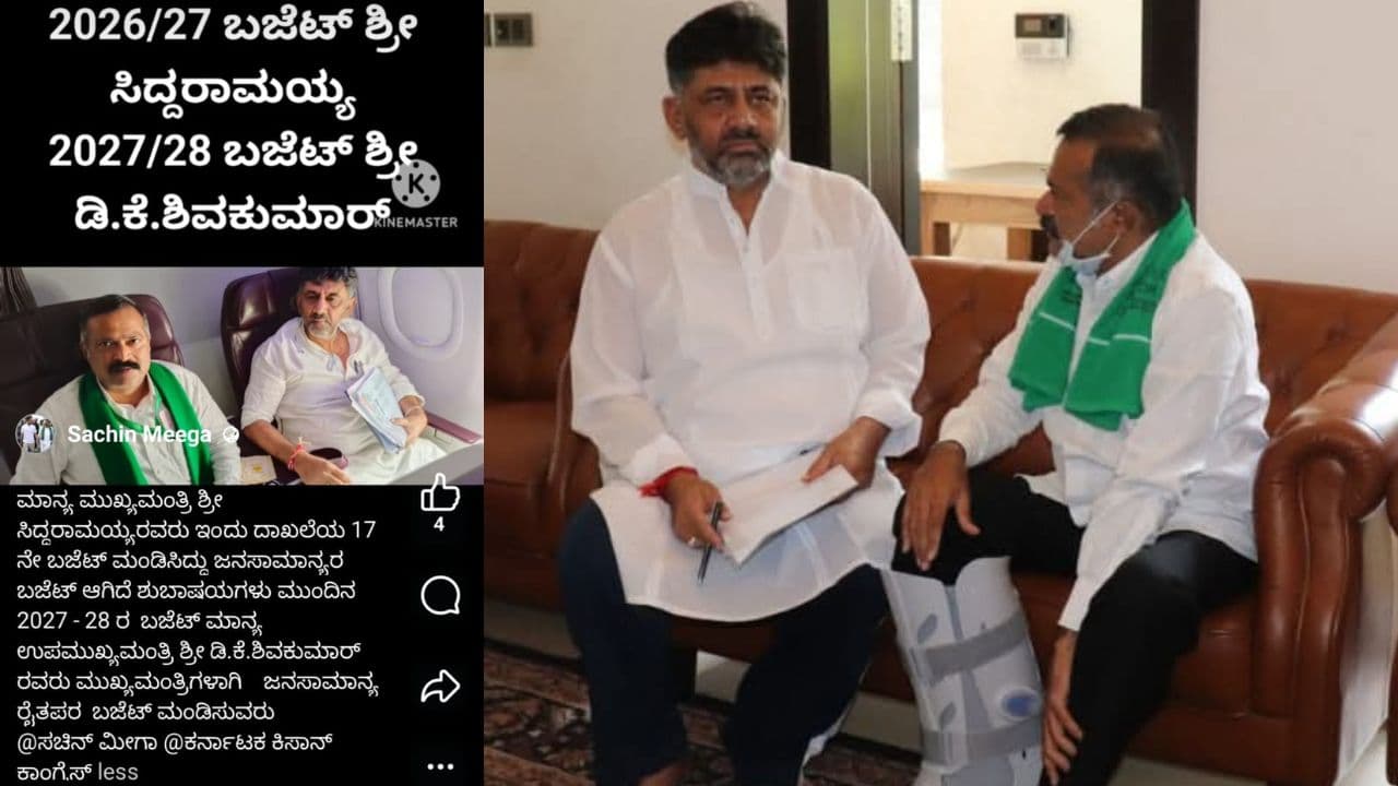 ಕಾಂಗ್ರೆಸ್ ಪಕ್ಷದ ಕಿಸಾನ್ ಘಟಕದ ರಾಜ್ಯಾಧ್ಯಕ್ಷ ಹಾಗೂ ಡಿಕೆ ಶಿವಕುಮಾರ್ ಅವರ ಪರಮಾಪ್ತ ಸಚಿನ್ ಮೀಗಾ ಅವರು ಸಾಮಾಜಿಕ ಜಾಲತಾಣದಲ್ಲಿ ಹಂಚಿಕೊಂಡಿರುವ ಪೋಸ್ಟ್ ಒಂದು ಈಗ ಕಾಂಗ್ರೆಸ್ ಹೈಕಮಾಂಡ್ ವರೆಗೂ ನಡುಕ ಹುಟ್ಟಿಸುವಂತಿದೆ. ‘ಈ ಬಾರಿ (2026-27) ಸಿದ್ದರಾಮಯ್ಯ ಅವರು ಬಜೆಟ್ ಮಂಡಿಸಿದ್ದಾರೆ. ಆದರೆ ಮುಂದಿನ 2027-28ನೇ ಸಾಲಿನ ಬಜೆಟ್ ಅನ್ನು ಡಿಕೆ ಶಿವಕುಮಾರ್ ಅವರು ಮುಖ್ಯಮಂತ್ರಿಗಳಾಗಿ ಮಂಡಿಸುತ್ತಾರೆ’ ಎಂದು ಬರೆದುಕೊಂಡಿದ್ದಾರೆ.