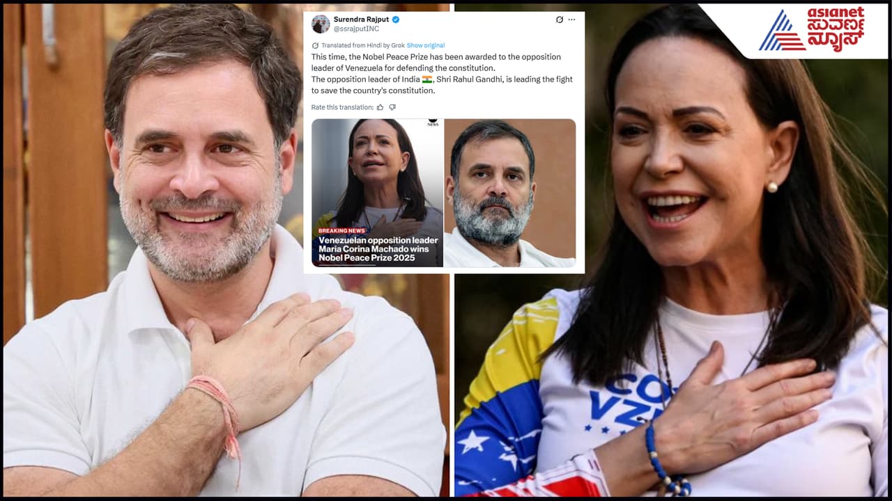 ವೆನೆಜುವೆಲಾದ ವಿಪಕ್ಷ ನಾಯಕಿ ಮಾರಿಯಾ ಕೊರಿನಾ ಮಚಾಡೋ ಅವರಿಗೆ ನೊಬೆಲ್ ಶಾಂತಿ ಪ್ರಶಸ್ತಿ ಘೋಷಣೆಯಾದ ಬೆನ್ನಲ್ಲೇ, ಭಾರತದಲ್ಲಿ ಪ್ರಜಾಪ್ರಭುತ್ವಕ್ಕಾಗಿ ಹೋರಾಡುತ್ತಿರುವ ರಾಹುಲ್ ಗಾಂಧಿಯವರಿಗೂ ಈ ಪ್ರಶಸ್ತಿ ಸಿಗಬೇಕಿತ್ತು ಎಂದು ಕಾಂಗ್ರೆಸ್ ನಾಯಕರು ಆಗ್ರಹಿಸಿದ್ದಾರೆ.