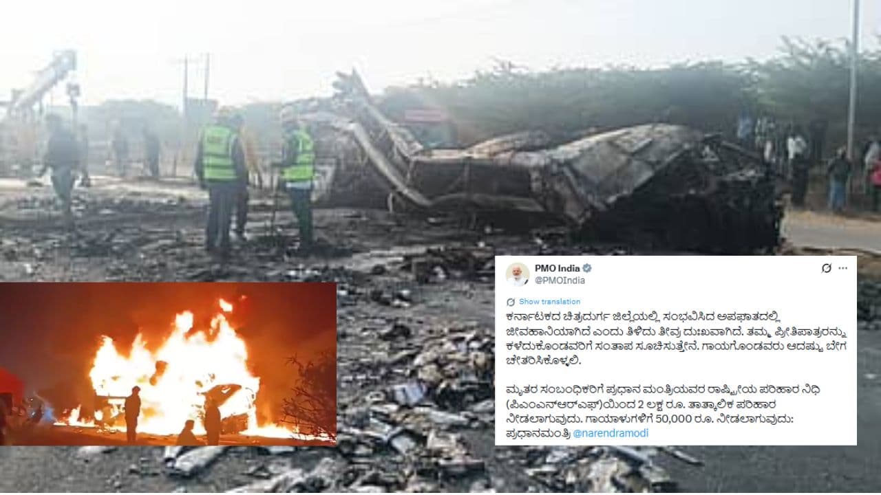 ಕರ್ನಾಟಕದ ಚಿತ್ರದುರ್ಗ ಜಿಲ್ಲೆಯಲ್ಲಿ ಸಂಭವಿಸಿದ ಅಪಘಾತದಲ್ಲಿ ಜೀವಹಾನಿಯಾಗಿದೆ ಎಂದು ತಿಳಿದು ತೀವ್ರ ದುಃಖವಾಗಿದೆ. ತಮ್ಮ ಪ್ರೀತಿಪಾತ್ರರನ್ನು ಕಳೆದುಕೊಂಡವರಿಗೆ ಸಂತಾಪ ಸೂಚಿಸುತ್ತೇನೆ. ಗಾಯಗೊಂಡವರು ಆದಷ್ಟು ಬೇಗ ಚೇತರಿಸಿಕೊಳ್ಳಲಿ. ಮೃತರ ಸಂಬಂಧಿಕರಿಗೆ ಪ್ರಧಾನ ಮಂತ್ರಿಯವರ ರಾಷ್ಟ್ರೀಯ ಪರಿಹಾರ ನಿಧಿ (ಪಿಎಂಎನ್ಆರ್ಎಫ್)ಯಿಂದ 2 ಲಕ್ಷ ರೂ. ತಾತ್ಕಾಲಿಕ ಪರಿಹಾರ ನೀಡಲಾಗುವುದು. ಗಾಯಾಳುಗಳಿಗೆ 50,000 ರೂ. ನೀಡಲಾಗುವುದು ಎಂದು ಟ್ವೀಟ್ ಮೂಲಕ ತಿಳಿಸಿದ್ದಾರೆ.
