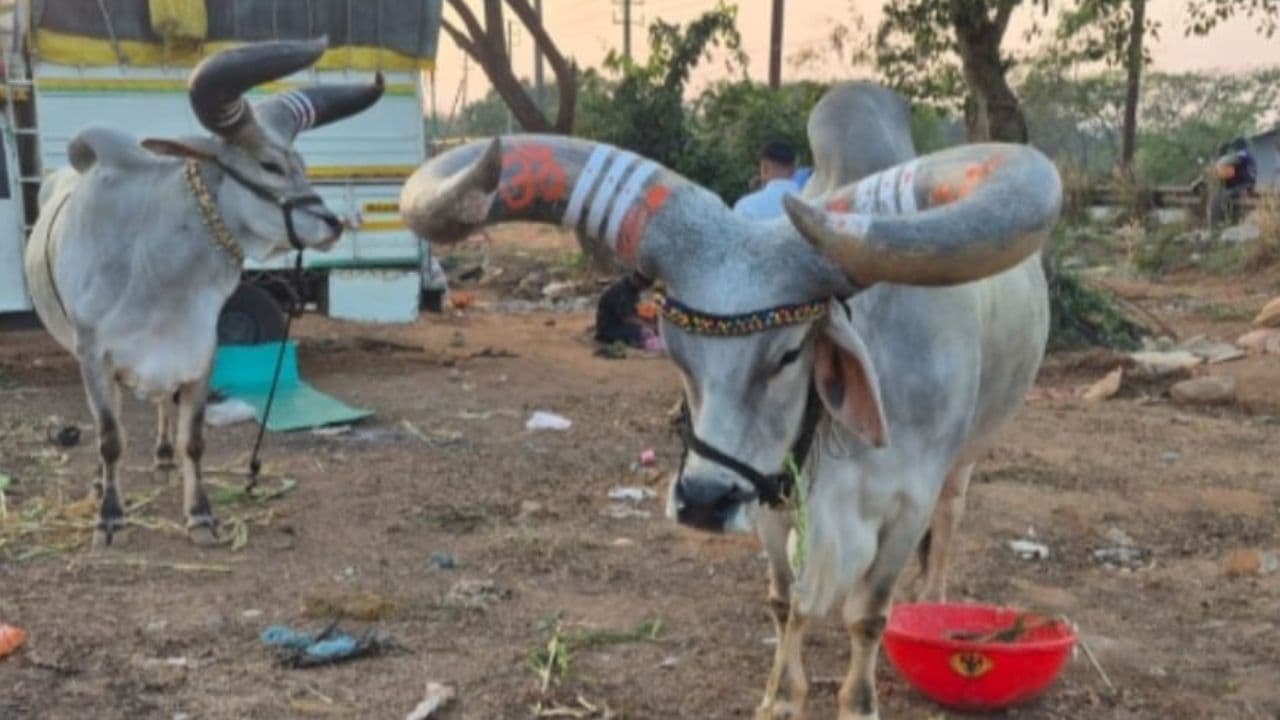 ಮೂರು ಬೃಹತ್ ಕಾಂಕ್ರೇಜ್ ಹೋರಿಗಳೊಂದಿಗೆ ಜೋಶಿ ಸಮಾಜದ ಭಕ್ತರಿಂದ ಪುಣ್ಯಕ್ಷೇತ್ರಗಳ ದರ್ಶನ | Maharashtra Devotees Visiting Holy Places Including Dharmasthala With Three Huge Kankrejj Bulls Mrq