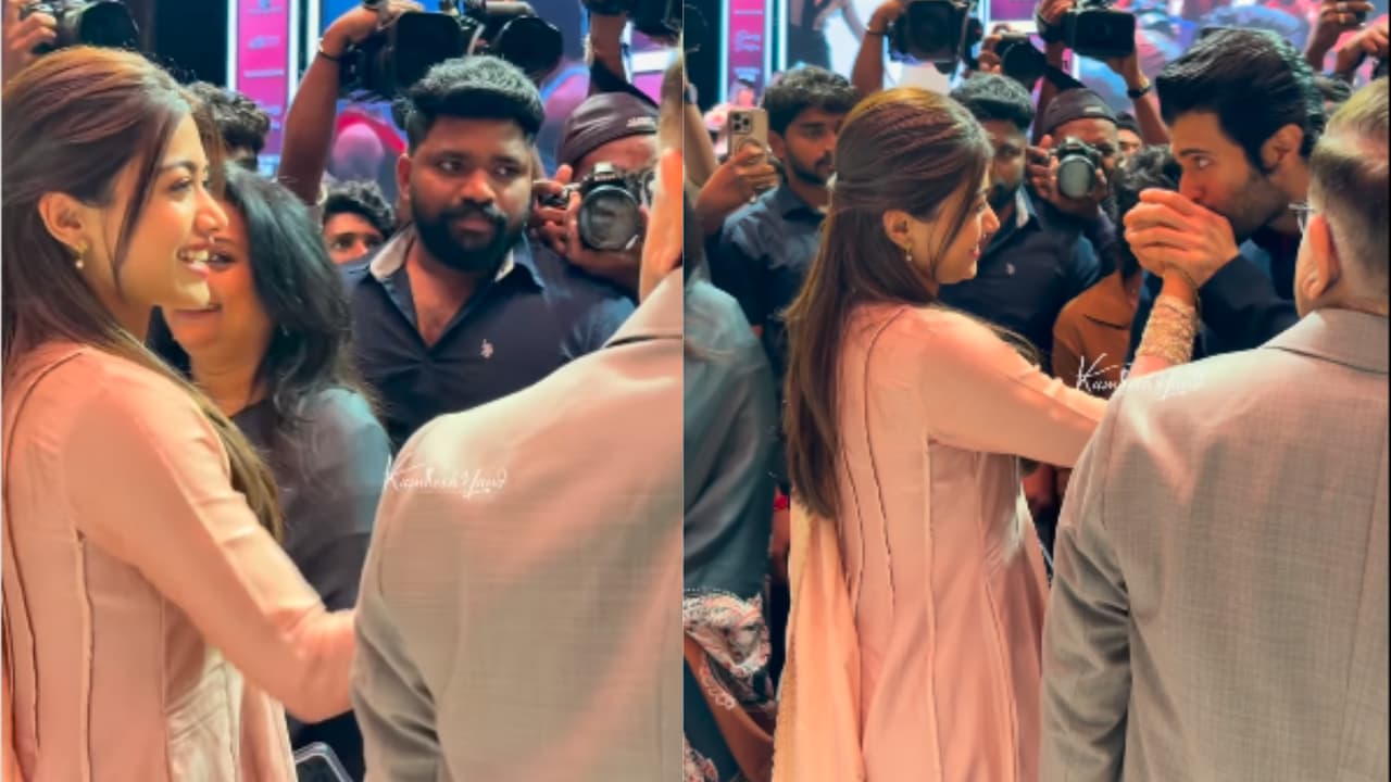 ದೇವರಕೊಂಡ ಆಗಮಿಸುತ್ತಿದ್ದಂತೆ ರಶ್ಮಿಕಾ ಮಂದಣ್ಣ ಮುಖದಲ್ಲಿ ಸಂಭ್ರಮ ಡಬಲ್ ಆಗಿದೆ. ವಿಜಯ್ ದೇವರಕೊಂಡ ಶೇಕ್ಹ್ಯಾಂಡ್ ಮೂಲಕ ಸ್ವಾಗತಿಸಲು ರಶ್ಮಿಕಾ ಕೈ ನೀಡಿದ್ದಾರೆ. ಆದರೆ ವಿಜಯ್ ದೇವರಕೊಂಡ ಕೈಗಳನ್ನು ಹಿಡಿದು ಮುತ್ತಿಟ್ಟಿದ್ದಾರೆ. ಇತ್ತ ರಶ್ಮಿಕಾ ಮಂದಣ್ಣ ನಾಚಿ ನೀರಾಗಿದ್ದಾರೆ.ಈ ವೇಳೆ ಸುತ್ತಲು ನೆರೆದಿದ್ದ ಮಾಧ್ಯಮಗಳ ಕ್ಯಾಮೆರಾ ಫೋಟೋ, ವಿಡಿಯೋ ಸೆರೆ ಹಿಡಿದಿದೆ. ಇತ್ತ ನೆರೆದಿದ್ದವರೂ ಓಹ್ ಎಂದು ಉದ್ಘರಿಸಿದ್ದಾರೆ. ಇದರಿಂದ ರಶ್ಮಿಕಾ ಮತ್ತಷ್ಟು ನಾಚಿಕೊಂಡಿದ್ದಾರೆ.