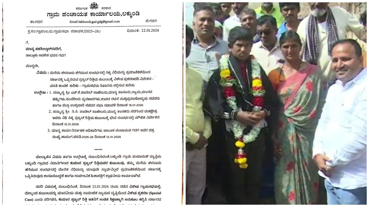 ಕಳೆದ ಜ.22ರಂದು ಗ್ರಾಪಂ ವಿಶೇಷ ಗ್ರಾಮಸಭೆ ಪ್ರಜ್ವಲ್ನ ತಾಯಿ ಗಂಗವ್ವನನ್ನು ಫಲಾನುಭವಿಯೆಂದು ಆಯ್ಕೆ ಮಾಡಿತ್ತು. ನಂತರ ಗಣರಾಜ್ಯೋತ್ಸವದಂದು ಜಿಲ್ಲಾ ಉಸ್ತುವಾರಿ ಸಚಿವ ಎಚ್.ಕೆ.ಪಾಟೀಲ ಅವರು ಸರ್ಕಾರದಿಂದ ₹5 ಲಕ್ಷ ಬಹುಮಾನದೊಂದಿಗೆ ಸೈಟ್ ನೀಡುವ ಪತ್ರ ನೀಡಿದ್ದರು. ಅದರಂತೆ ಗುರುವಾರ ರಿತ್ತಿ ಕುಟುಂಬಕ್ಕೆ ನಿವೇಶನ ಸಿಕ್ಕಿದೆ.