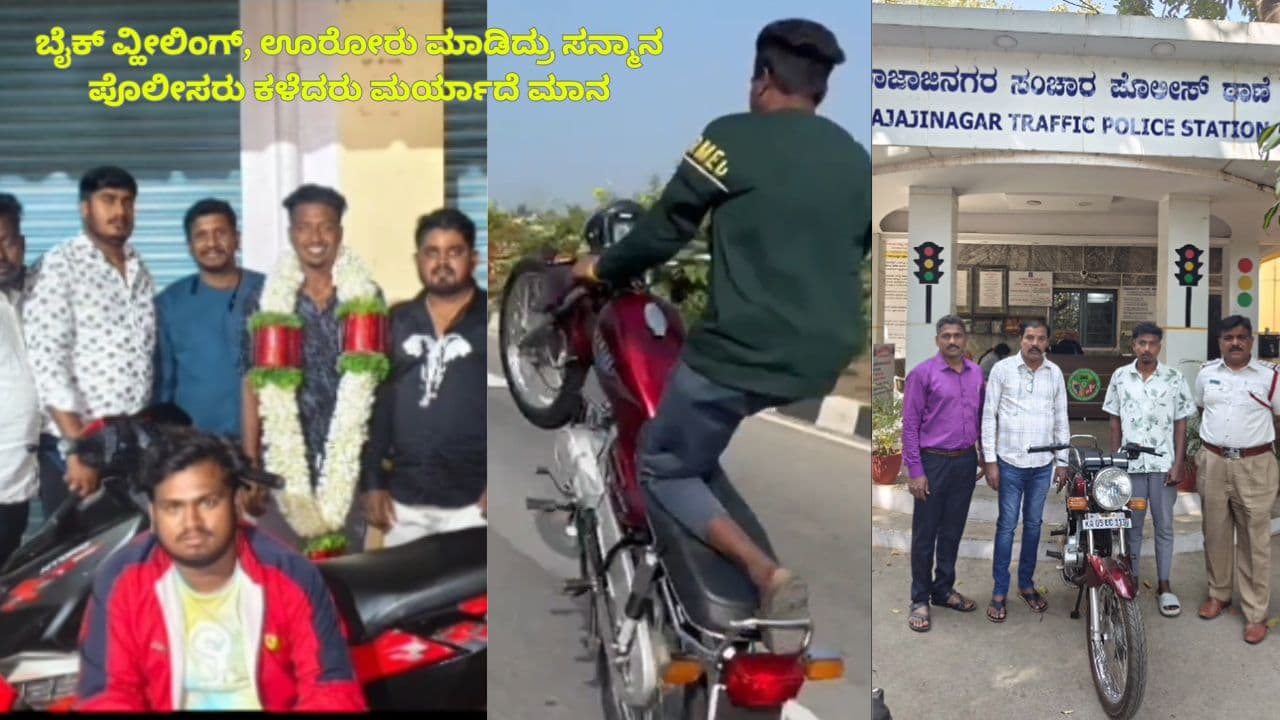 ಬೆಂಗಳೂರಿನಲ್ಲಿ ಬೈಕ್ ವ್ಹೀಲಿಂಗ್ ಮಾಡಿ, ವಿಡಿಯೋವನ್ನು ಸೋಷಿಯಲ್ ಮೀಡಿಯಾದಲ್ಲಿ ವೈರಲ್ ಮಾಡಲು ಯತ್ನಿಸಿದ ಯುವಕನನ್ನು ರಾಜಾಜಿನಗರ ಸಂಚಾರ ಪೊಲೀಸರು ಬಂಧಿಸಿದ್ದಾರೆ. ಈತನನ್ನು ಸ್ಥಳೀಯರು ಸನ್ಮಾನಿಸಿದ್ದರು, ಆದರೆ ವಿಡಿಯೋ ಆಧರಿಸಿ ಪೊಲೀಸರು ಆತನನ್ನು ಬಂಧಿಸಿ ಬೈಕ್ ವಶಪಡಿಸಿಕೊಂಡಿದ್ದಾರೆ.