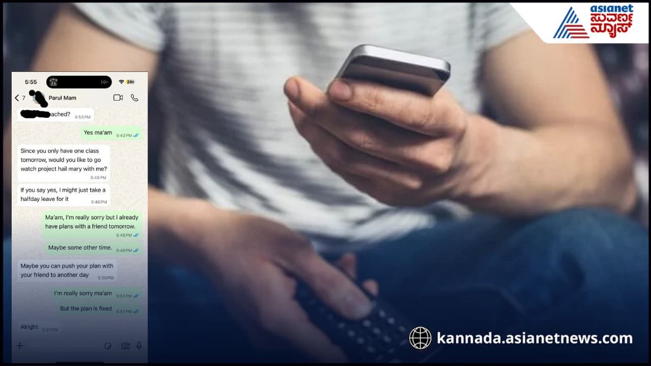 18 ವರ್ಷದ ವಿದ್ಯಾರ್ಥಿ ಜೊತೆ ಶಿಕ್ಷಿಕಿ ಚಾಟ್ ಮಾಡಿದ್ದಾರೆ. ನಿಮಗೆ ನಾಳೆ ಒಂದೇ ಕ್ಲಾಸ್ ಇರೋದ್ರಿಂದ ನೀವು ನನ್ನ ಜೊತೆ ಪ್ರಾಜೆಕ್ಟ್ ಹೇಲ್ ಮೇರಿ ನೋಡಲು ಬರ್ತೀರಾ? ನೀವು ಬರ್ತೀರಾ ಅಂದ್ರೆ ನಾನು ಅರ್ಧ ದಿನ ರಜೆ ತೆಗೆದುಕೊಳ್ತೇನೆ ಅಂತ ಮೆಸ್ಸೇಜ್ ಮಾಡಿದ್ದಾರೆ. ಈ ಮೆಸ್ಸೇಜ್ ಗೆ ವಿದ್ಯಾರ್ಥಿ ಬುದ್ಧಿವಂತಿಕೆಯಿಂದ ಉತ್ತರ ನೀಡಿದ್ದಾರೆ. ನೇರವಾಗಿ ಬರೋದಿಲ್ಲ ಎನ್ನುವ ಬದಲು, ನನ್ನ ಸ್ನೇಹಿತರ ಜೊತೆ ಮೊದಲೇ ಪ್ಲಾನ್ ಫಿಕ್ಸ್ ಆಗಿದೆ. ಹಾಗಾಗಿ ನಾಳೆ ಬರೋದಿಕ್ಕೆ ಆಗೋದಿಲ್ಲ. ಇನ್ನೊಮ್ಮೆ ನೋಡೋಣ ಅಂತ ಮೆಸ್ಸೇಜ್ ಮಾಡಿದ್ದಾರೆ. ಆದ್ರೆ ಶಿಕ್ಷಕಿ ತಮ್ಮ ಒತ್ತಾಯ ಬಿಡಲಿಲ್ಲ. ನೋಡಿ, ಇನ್ನೊಮ್ಮೆ ಯೋಚಿಸಿ ಅಂತ ಮತ್ತೆ ಶಿಕ್ಷಕಿ ಮೆಸ್ಸೇಜ್ ಹಾಕಿದ್ದಾರೆ. ಇದಕ್ಕೆ ವಿದ್ಯಾರ್ಥಿ, ಕ್ಷಮೆ ಇರಲಿ, ಆಗ್ಲೇ ಫಿಕ್ಸ್ ಪ್ಲಾನ್ ಫಿಕ್ಸ್ ಆಗಿದೆ ಅಂತ ವಾಪಸ್ ಮೆಸ್ಸೇಜ್ ಮಾಡಿದ್ದಾರೆ.