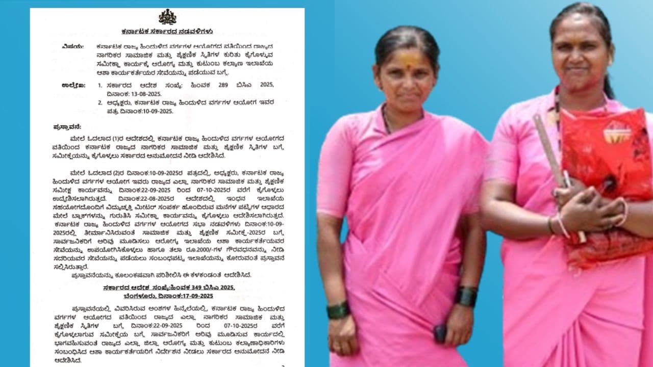 ಹೀಗಾಗಿ, ಕರ್ನಾಟಕ ರಾಜ್ಯ ಹಿಂದುಳಿದ ವರ್ಗಗಳ ಆಯೋಗದ ಸಭೆಯಲ್ಲಿ ‘ಸಾಮಾಜಿಕ ಮತ್ತು ಶೈಕ್ಷಣಿಕ ಸಮೀಕ್ಷೆ-2025’ರ ಬಗ್ಗೆ ಸಾರ್ವಜನಿಕರಿಗೆ ಅರಿವು ಮೂಡಿಸಲು ಆರೋಗ್ಯ ಇಲಾಖೆಯ ಆಶಾ ಕಾರ್ಯಕರ್ತೆಯವರ ಸೇವೆಯನ್ನು ಉಪಯೋಗಿಸಿಕೊಳ್ಳಲು ತೀರ್ಮಾನ ಮಾಡಲಾಗಿದೆ. ಜೊತೆಗೆ, ಆಶಾ ಕಾರ್ಯಕರ್ತೆಯರಿಗೆ ತಲಾ ರೂ.2000ಗಳ ಗೌರವಧನವನ್ನು ನೀಡಿ ಸೇವೆಯನ್ನು ಪಡೆಯಲು ಸಂಬಂಧಪಟ್ಟ ಇಲಾಖೆ ಅನುಮತಿಗೆ ಪ್ರಸ್ತಾವನೆ ಸಲ್ಲಿಸಲಾಗಿತ್ತು. ಈ ಪ್ರಸ್ತಾವನೆಯನ್ನು ಪರಿಶೀಲಿಸಿ ಆರೋಗ್ಯ ಇಲಾಕೆ ಈ ಕೆಳಗಿನಂತೆ ಆದೇಶ ಹೊರಡಿಸಿದೆ.