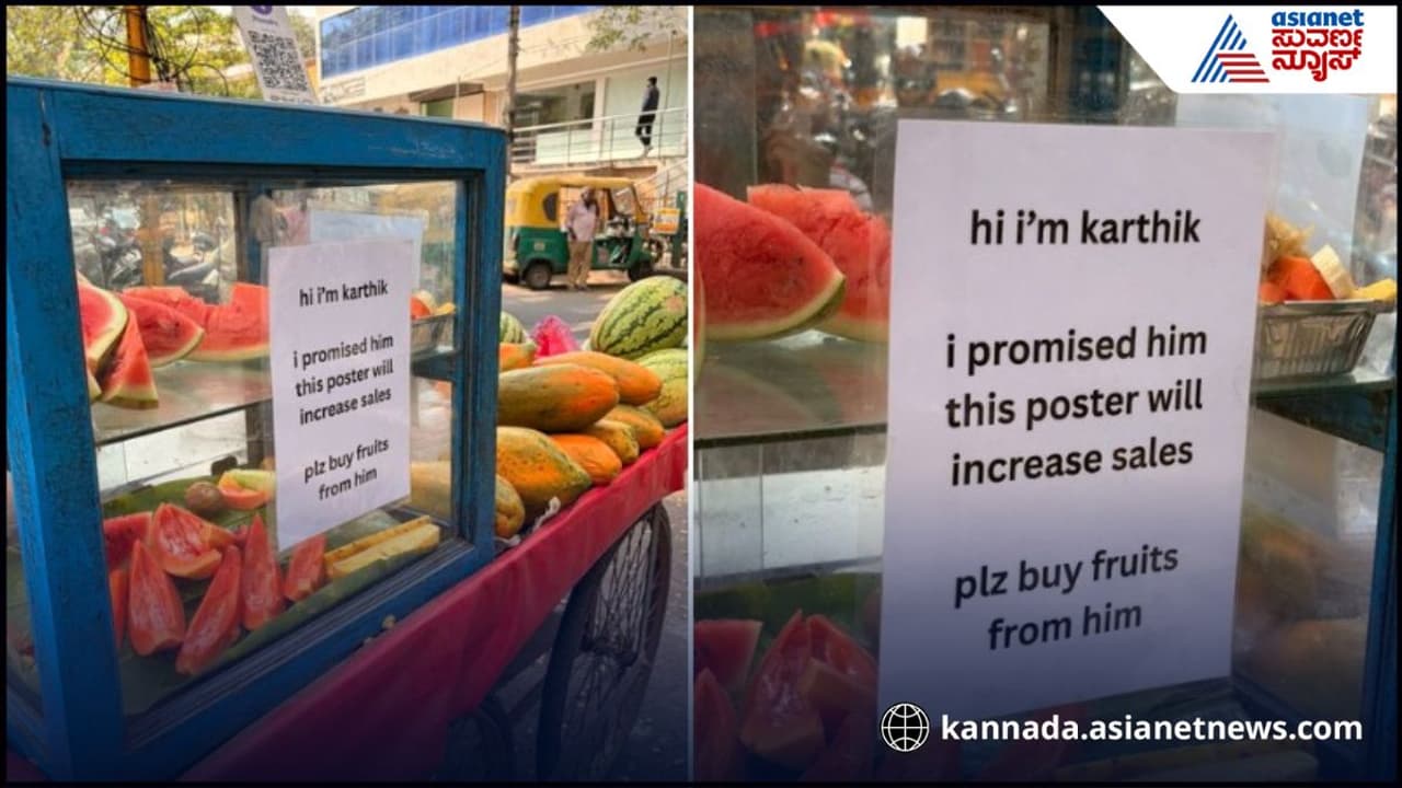 ಫ್ರೂಟ್ ಬೌಲ್ ಹಾಗೂ ಹಣ್ಣನ್ನು ಮಾರಾಟ ಮಾಡುವ ತಳ್ಳು ಗಾಡಿಯ ಗ್ಲಾಸ್ ಗೆ ಒಂದು ಪೋಸ್ಟ್ ಅಂಟಿಸಲಾಗಿದೆ. ಅದ್ರಲ್ಲಿ, ಹಾಯ್ ನಾನು ಕಾರ್ತಿಕ್. ಈ ಪೋಸ್ಟ್ ನಂತ್ರ ಸೇಲ್ ಹೆಚ್ಚಾಗುತ್ತೆ ಅಂತ ನಾನು ಇವರಿಗೆ ಪ್ರಾಮೀಸ್ ಮಾಡಿದ್ದೇನೆ. ದಯವಿಟ್ಟು ಇವರಿಂದ ಹಣ್ಣು ಖರೀದಿಸಿ ಅಂತ ಗ್ಲಾಸ್ ಮೇಲೆ ಬರೆಯಲಾಗಿದೆ. ಎಕ್ಸ್ ಖಾತೆಯಲ್ಲಿ ಅಶ್ವಿನ್ ಕುಮಾರ್ ಎನ್ನುವವರು ಇದ್ರ ಫೋಟೋ ಪೋಸ್ಟ್ ಮಾಡಿದ್ದಾರೆ. ಇದು ಇಂದಿನ @peakbengaluru. ಇಷ್ಟವಾಯಿತು ಅಂತ ಶೀರ್ಷಿಕೆ ಹಾಕಿದ್ದಾರೆ.