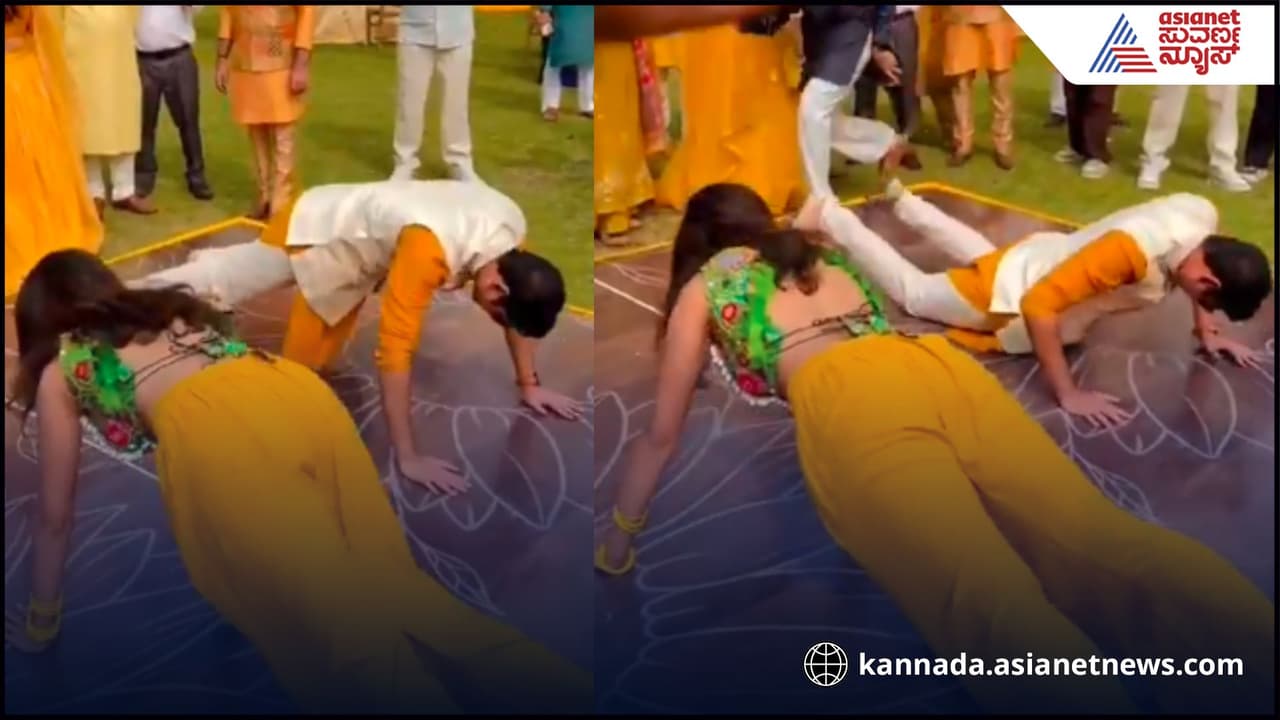 ಸಾಮಾನ್ಯವಾಗಿ ಹಳದಿ ಶಾಸ್ತ್ರದಲ್ಲಿ ಹಾಡು-ಕುಣಿತ ಇರುತ್ತದೆ. ಆದರೆ ಇಲ್ಲಿನ ಕುಟುಂಬಸ್ಥರು ವಧು-ವರರ ಫಿಟ್ನೆಸ್ ಪರೀಕ್ಷಿಸಲು ಮುಂದಾಗಿದ್ದಾರೆ. ಎಲ್ಲರ ಮುಂದೆ ನೆಲದ ಮೇಲೆ ಚಾಪೆ ಹಾಸಿ, ವಧು ಮತ್ತು ವರನಿಗೆ ‘ಪುಷ್-ಅಪ್’ ಮಾಡುವ ಚಾಲೆಂಜ್ ನೀಡಿದ್ದಾರೆ. ಶುರುವಿನಲ್ಲಿ ಇಬ್ಬರೂ ‘ನಾನೇನು ಕಡಿಮೆಯಿಲ್ಲ’ ಎನ್ನುವಂತೆ ಉತ್ಸಾಹದಿಂದ ಕಸರತ್ತು ಆರಂಭಿಸಿದ್ದಾರೆ. ನೆರೆದಿದ್ದ ಸಂಬಂಧಿಕರು ಚಪ್ಪಾಳೆ ತಟ್ಟಿ ಹುರಿದುಂಬಿಸಿದ್ದಾರೆ.