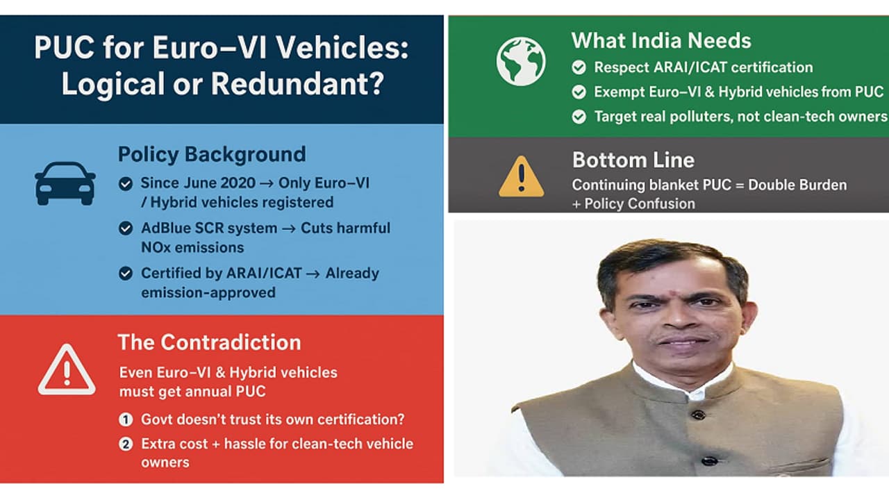 AdBlue ಹೊಂದಿರುವ ಯೂರೋ–VI ಅಥವಾ ಹೈಬ್ರಿಡ್ ವಾಹನಗಳಿಗೆ ಪ್ರತ್ಯೇಕವಾಗಿ PUC ಕಡ್ಡಾಯವಿಲ್ಲದೆ ಇರುವುದು ಯುಕ್ತಿ.