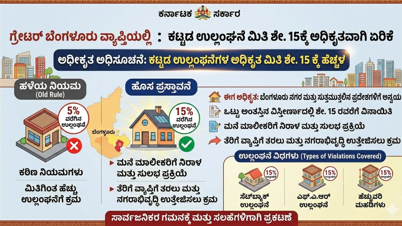 ಗ್ರೇಟರ್ ಬೆಂಗಳೂರು ಪ್ರಾಧಿಕಾರ (GBA) ವ್ಯಾಪ್ತಿಯಲ್ಲಿ ಕಟ್ಟಡ ಉಲ್ಲಂಘನೆಯ ಮಿತಿಯನ್ನು ಶೇ. 5 ರಿಂದ ಶೇ. 15 ಕ್ಕೆ ಹೆಚ್ಚಿಸಲು ರಾಜ್ಯ ಸರ್ಕಾರ ನಿರ್ಧರಿಸಿದೆ. ಈ ತಿದ್ದುಪಡಿಯು, ಸ್ವಾಧೀನಾನುಭವ ಪ್ರಮಾಣ ಪತ್ರ (OC) ಸಿಗದೆ ಸಂಕಷ್ಟದಲ್ಲಿದ್ದ ಸಾವಿರಾರು ಮಾಲೀಕರಿಗೆ ನೆರವಾಗಲಿದೆ.