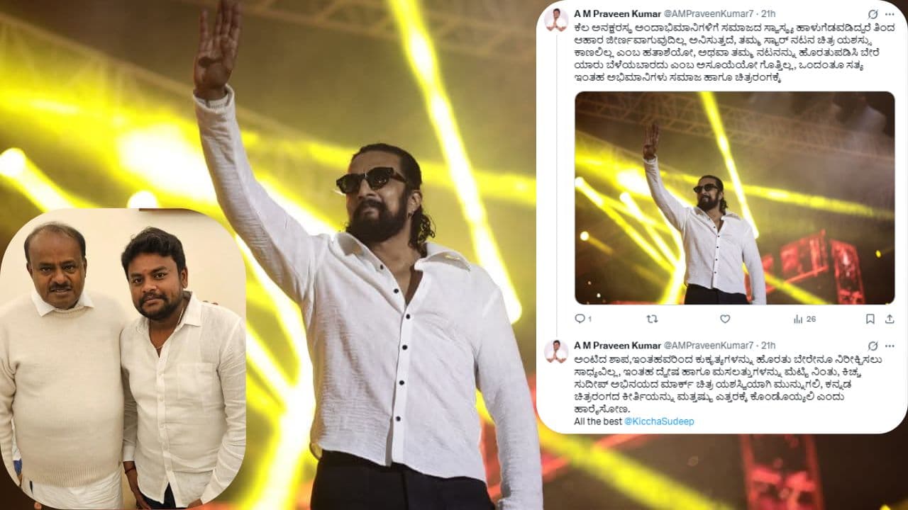 ಕಿಚ್ಚ ಸುದೀಪ್-ದರ್ಶನ್ ಅಭಿಮಾನಿಗಳ ವಾರ್ಗೆ ರಾಜಕೀಯದ ಎಂಟ್ರಿ! ಜೆಡಿಎಸ್ ಮುಖಂಡನ ಪ್ರವೀಣ್ ಕುಮಾರ್ ಆಕ್ರೋಶ ಹೊರಹಾಕಿದ್ದಾರೆ. ಸುದೀಪ್ ‘ಯುದ್ಧ’ದ ಹೇಳಿಕೆ, ವಿಜಯಲಕ್ಷ್ಮಿ ಕೌಂಟರ್ ವಿವರ ತಿಳಿಯಲು ಓದಿ.