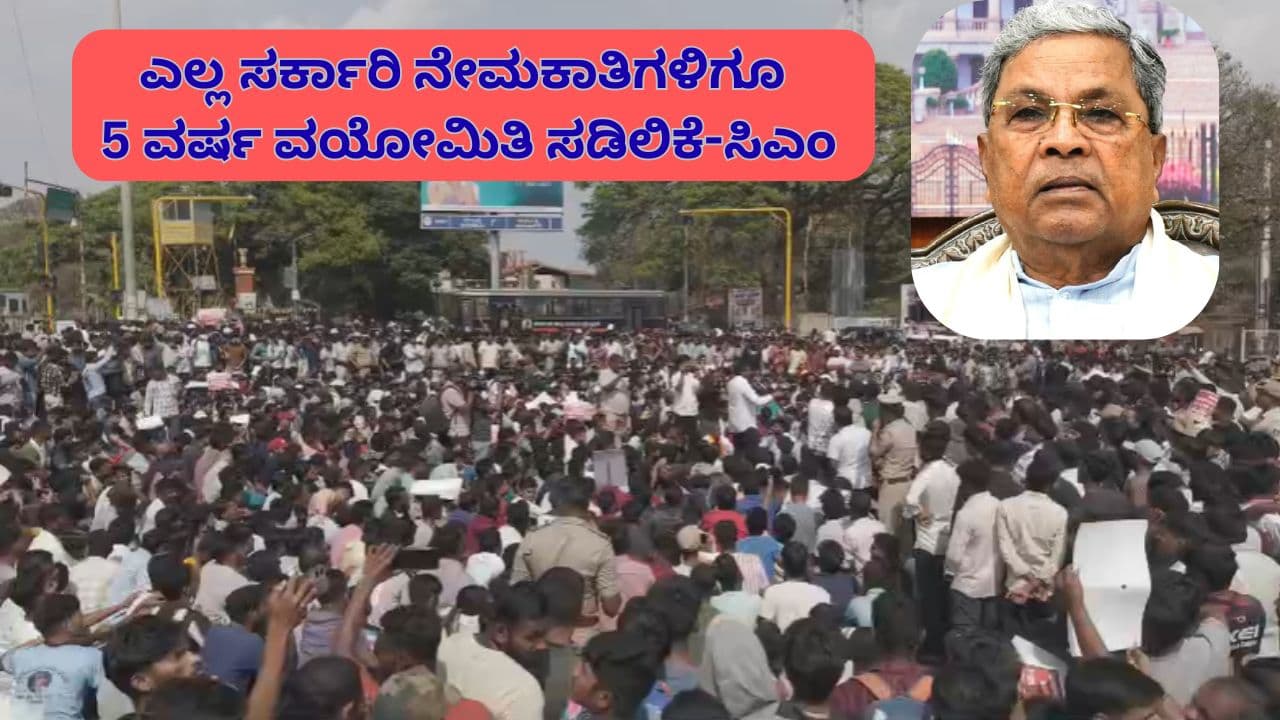 ಬೆಂಗಳೂರು/ಧಾರವಾಡ (ಫೆ.24): ಕಳೆದ ಕೆಲವು ದಿನಗಳಿಂದ ಧಾರವಾಡದಲ್ಲಿ ಸರ್ಕಾರಿ ಉದ್ಯೋಗಾಕಾಂಕ್ಷಿಗಳು ನಡೆಸುತ್ತಿರುವ ಸರಣಿ ಪ್ರತಿಭಟನೆಯನ್ನು ಗಂಭೀರವಾಗಿ ಪರಿಗಣಿಸಿರುವ ಮುಖ್ಯಮಂತ್ರಿ ಸಿದ್ದರಾಮಯ್ಯ ಅವರು, ಅಭ್ಯರ್ಥಿಗಳಿಗೆ ದೊಡ್ಡ ಸಮಾಧಾನಕರ ಸುದ್ದಿಯೊಂದನ್ನು ನೀಡಿದ್ದಾರೆ. ನೇಮಕಾತಿ ವಿಳಂಬದಿಂದಾಗಿ ವಯೋಮಿತಿ ಮೀರುತ್ತಿರುವ ಆತಂಕದಲ್ಲಿರುವ ಯುವಜನತೆಗಾಗಿ ಮುಂಬರುವ ನೇಮಕಾತಿಗಳಲ್ಲಿ ವಯೋಮಿತಿಯನ್ನು 5 ವರ್ಷಗಳವರೆಗೆ ಸಡಿಲಿಸುವುದಾಗಿ ಮುಖ್ಯಮಂತ್ರಿಗಳು ಘೋಷಿಸಿದ್ದಾರೆ.