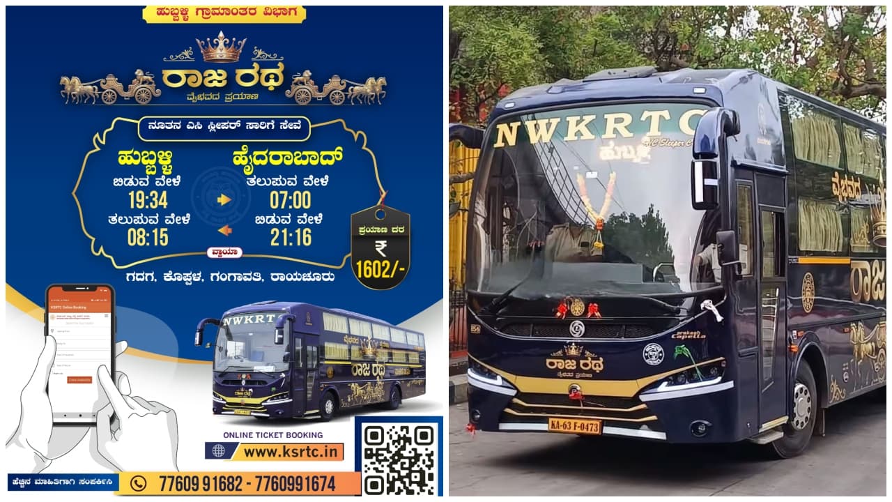 ವಾಯವ್ಯ ಕರ್ನಾಟಕ ರಸ್ತೆ ಸಾರಿಗೆ ಸಂಸ್ಥೆಯು (NWKRTC) ಹುಬ್ಬಳ್ಳಿ ಮತ್ತು ಹೈದರಾಬಾದ್ ನಡುವೆ ಹೊಸ ರಾಜರಥ ಎಸಿ ಸ್ಲೀಪರ್ ಬಸ್ ಸೇವೆಯನ್ನು ಆರಂಭಿಸಿದೆ. ಈ ಬಸ್ ಗದಗ, ಕೊಪ್ಪಳ, ರಾಯಚೂರು ಮಾರ್ಗವಾಗಿ ಸಂಚರಿಸಲಿದ್ದು, ಪ್ರಯಾಣಿಕರಿಗೆ ಆರಾಮದಾಯಕ ಪ್ರಯಾಣದ ಅನುಭವ ನೀಡಲಿದೆ. ಮುಂಗಡ ಟಿಕೆಟ್ ಬುಕ್ಕಿಂಗ್ ಹಾಗೂ ವಿಶೇಷ ರಿಯಾಯಿತಿಗಳು ಲಭ್ಯವಿವೆ.
