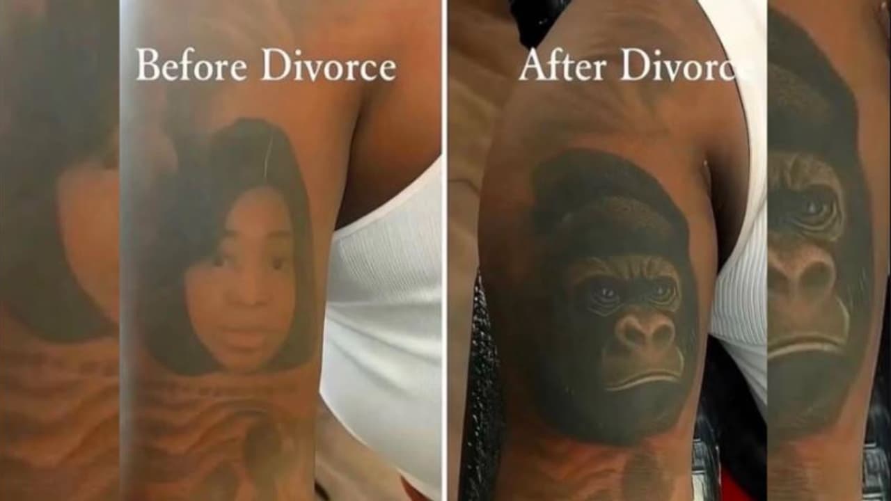 ಮದುವೆಗೂ ಮುನ್ನ ಪ್ರೇಯಸಿಯ ಫೋಟೋವನ್ನು ತೋಳಿನ ಮೇಲೆ ಟ್ಯಾಟೂ ಹಾಕಿಸಿಕೊಂಡಿದ್ದ ಯುವಕ, ವಿಚ್ಛೇದನದ ನಂತರ ಅದೇ ಟ್ಯಾಟೂವನ್ನು ಗೊರಿಲ್ಲಾದ ಚಿತ್ರವಾಗಿ ಪರಿವರ್ತಿಸಿದ್ದಾನೆ. ಈ ಮೊದಲು ಮತ್ತು ನಂತರದ ಫೋಟೋಗಳು ಸಾಮಾಜಿಕ ಜಾಲತಾಣದಲ್ಲಿ ವೈರಲ್ ಆಗಿದೆ.