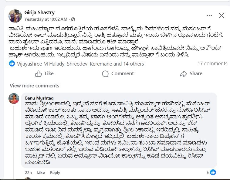 ಈ ಬಗ್ಗೆ ಅವರು ಫೇಸ್ಬುಕ್ನಲ್ಲಿ ಇಂಥದ್ದೇ ವಿಚಾರ ಹಂಚಿಕೊಂಡಿರುವ ಗಿರಿಜಾ ಶಾಸ್ತ್ರಿ ಅವರಿಗೆ ಕಾಮೆಂಟ್ ಮಾಡಿದ್ದು, ‘ನಾನು ಶ್ರೀಲಂಕಾದಲ್ಲಿ ಇದ್ದೇನೆ. ನನಗೆ ಕೂಡ ಸಾವಿತ್ರಿ ಮಜಮ್ಹಾರ್ ಹೆಸರಿನಲ್ಲಿ ಮೆಸೆಂಜರ್ ವಿಡಿಯೋ ಕಾಲ್ ಬಂತು. ನಾನು ಅದನ್ನು ಸಾವಿತ್ರಿ ಮನ್ನಿಂದರ್ ಹೆಸರನ್ನು ನೋಡಿ ರಿಸೀವ್ ಮಾಡಿದೆ. ಯಾರೋ ಒಬ್ಬ ತನ್ನ ಖಾಸಗಿ ಅಂಗಗಳನ್ನು ಅತ್ಯಂತ ಅಸಭ್ಯವಾಗಿ ಪ್ರದರ್ಶಿಸಿ ಲೈಂಗಿಕ ಕ್ರಿಯೆಯಲ್ಲಿ ತೊಡಗಿದ್ದನ್ನು ತೋರಿಸಿದ. ನನಗೆ ಗಾಬರಿಯಾಗಿ ಅದನ್ನು ಕಟ್ ಮಾಡಿದೆ. ಇಡೀ ದಿನ ಮನಸ್ಸೆಲ್ಲಾ ವ್ಯಗ್ರವಾಗಿತ್ತು. ಶ್ರೀಲಂಕಾದಲ್ಲಿ ಇರದಿದ್ದಲ್ಲಿ ಸಾಹಿತ್ಯ ಕಾರ್ಯಕ್ರಮದಲ್ಲಿ ತೊಡಗಿಸಿಕೊಳ್ಳದೆ ಇದ್ದಿದ್ದಲ್ಲಿ ಬಹುಶಃ ನಾನು ಡಿಪ್ರೆಶನ್ ಗೆ ಒಳಗಾಗುತ್ತಿದ್ದೆ. ಜೊತೆಯಲ್ಲಿ ಇರುವ ಮಗಳು ಸಮೀನಾ ತುಂಬಾ ಸಮಾಧಾನ ಮಾಡಿದಳು. ಬಹುಶ ಮೆಸೆಂಜರ್ ನಲ್ಲಿ ಬರುವ ವಿಡಿಯೋ ಕಾಲ್ಗಳನ್ನು ರಿಸೀವ್ ಮಾಡಬಾರದು ಮತ್ತು ವಾಟ್ಸಪ್ ನಲ್ಲಿ ಬರುವ ಅನ್ನೋನ್ ವಿಡಿಯೋ ಕಾಲ್ಗಳನ್ನು ಕೂಡ ದಯವಿಟ್ಟು ರಿಸೀವ್ ಮಾಡಬೇಡಿ’ ಎಂದು ಬರೆದಿದ್ದಾರೆ.