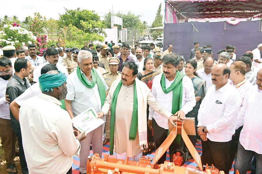 ಬೀಜ ಬಿತ್ತನೆ ಬಳಿಕ ರೈತ ಫಲಾನುಭವಿಗಳಿಗೆ ಕೃಷಿ ಯಂತ್ರೋಪಕರಣಗಳನ್ನು ಸಚಿವರು ವಿತರಿಸಿದರು‌. ಎಂಆರ್‌1 ರಾಗಿ ಬಿತ್ತನೆ ಮಾಡಿದ ನಂತರ, ನ್ಯಾನೋ ಯೂರಿಯಾವನ್ನು ಡ್ರೋಣ್‌ ಮೂಲಕ ಮುಸುಕಿನ ಜೋಳದ ಬೆಳೆಗೆ ಸಿಂಪಡಣೆ ಮಾಡಿದರು. ಇದೇ ವೇಳೆ, ಕೃಷಿ ಇಲಾಖೆ ಮೂಲಕ ಪಿ.ದಯಾನಂದರ ಸುಸ್ಧಿರ ಕೃಷಿ ಬಗ್ಗೆ ಸಾಕ್ಷ್ಯಚಿತ್ರ ಮಾಡಿಸಿದ ಸಚಿವರು, ಸುಸ್ಧಿರ ಕೃಷಿ ಬಗ್ಗೆ ಸ್ವತಃ ಸಚಿವರೇ ಸಂದರ್ಶನ ಮಾಡಿದರು. ಸಂದರ್ಶನದ ನಂತರ ದಯಾನಂದ ಅವರು ಬೆಳೆದಿರುವ ಹತ್ತಾರು ಬೆಳೆ ಮಾದರಿ, ನೂರಾರು ಬಗೆ ಬಗೆಯ ಹಣ್ಣಿನ ಗಿಡಗಳು, ಸಾವಿರಾರು ಜಾತಿ ಸಸ್ಯಗಳು, ಬರಗೂರ್, ಹಳ್ಳಿಕಾರ್ ತಳಿ ಹಸುಗಳು, ಕುರಿ ಕೋಳಿ, ಮೇಕೆ ಹಾಗೂ ಕತ್ತೆಗಳು, ಅಡುಗೆ ಎಣ್ಣೆ ಘಟಕ, ಸುಗಂಧ ತಯಾರಿಕಾ ಘಟಕ, ರೇಷ್ಮೆಘಟಕ, ವಿವಿಧ ಬಗೆ ಪರಿಕರಗಳ ಜೊತೆಗೆ ಎತ್ತಿನಗಾಡಿ, ಕುದುರೆಗಾಡಿ, ವಿವಿಧ ಮಾದರಿ ಸ್ಕೂಟರ್‌ ಮತ್ತು ಕಾರುಗಳನ್ನು ವೀಕ್ಷಣೆ ಮಾಡಿದರು.