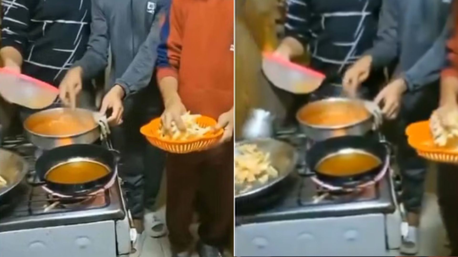ಇಬ್ಬರು ಹುಡುಗರು ಒಟ್ಟಿಗೆ ಅಡುಗೆ ಮಾಡುವುದರಲ್ಲಿ ನಿರತರಾಗಿದ್ದರೆ, ಮೂರನೇ ಹುಡುಗ ಕತ್ತರಿಸಿದ ಆಲೂಗಡ್ಡೆಯೊಂದಿಗೆ ಹತ್ತಿರದಲ್ಲಿ ನಿಂತಿದ್ದಾನೆ. ಆಮೇಲೇನಾಯ್ತು ನೋಡಿ…