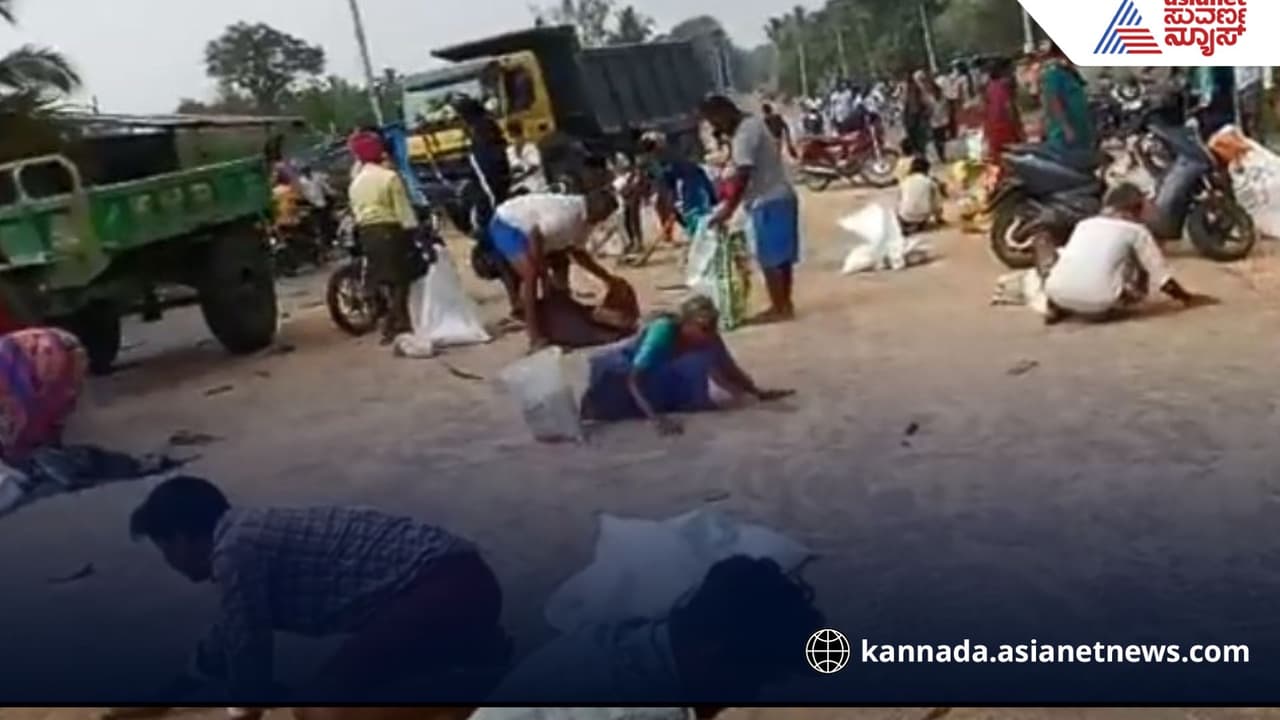ಲಾರಿಯಲ್ಲಿದ್ದ ಗೋಧಿ ತುಂಬಿದ ಚೀಲ ನೆಲಕ್ಕುರಳಿ ರಸ್ತೆಯೆಲ್ಲ ಗೋಧಿಮಯವಾಗಿತ್ತು. ಈ ವೇಳೆ, ಗೋಧಿಯನ್ನು ಬಾಚಿಕೊಳ್ಳಲು ಜನರು ಮುಗಿಬಿದ್ದಿದ್ದು, ಈ ದೃಶ್ಯ ಸಾಮಾಜಿಕ ಜಾಲತಾಣಗಳಲ್ಲಿ ವೈರಲ್ ಆಗಿದೆ.