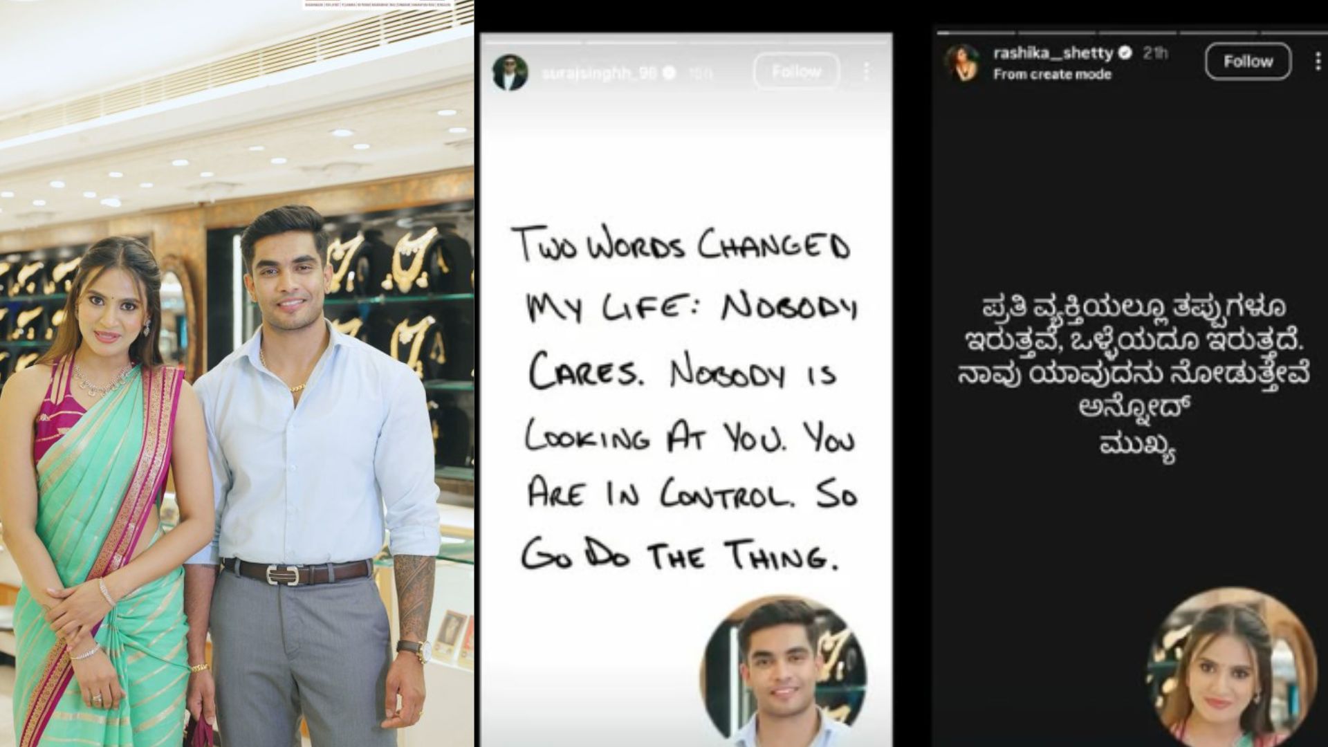 ಇಬ್ಬರ ನಡುವೆ ಇಷ್ಟೆಲ್ಲಾ ಆತ್ಮೀಯತೆ ಇರುವಾಗ ಒಂದು ದಿನದ ಹಿಂದೆ ಸೂರಜ್‌ ತಮ್ಮ ಇನ್ಸ್‌ಟಾಗ್ರಾಮ್‌ ಸ್ಟೋರಿಯಲ್ಲಿ ಒಂದು ವಿಚಾರ ಬರೆದುಕೊಂಡಿದ್ದಾರೆ. ‘ನನ್ನ ಜೀವನವನ್ನು ಬದಲಾಯಿಸಿದ ಎರಡು ಮಾತುಗಳು: ಯಾರಿಗೂ ಚಿಂತೆಯಿಲ್ಲ. ಯಾರೂ ನಿಮ್ಮನ್ನು ನೋಡುತ್ತಿಲ್ಲ. ನೀವು ನಿಯಂತ್ರಣದಲ್ಲಿ ನೀವಿದ್ದೀರಿ. ಆದ್ದರಿಂದ ಕೆಲಸ ಮಾಡಿ’ ಎಂದು ಅವರು ಬರೆದುಕೊಂಡಿದ್ದಾರೆ. ಅವರು ಹೇಳಿರುವ ಈ ಮಾತುಗಳು ಯಾರಿಗೆ ಅಂತಾ ಗೊತ್ತಾಗೋಕು ಮುಂಚೆಯೇ, ರಾಶಿಕಾ ಶೆಟ್ಟಿ ಅವರ ಇನ್ಸ್‌ಟಾಗ್ರಾಮ್‌ ಸ್ಟೋರಿಯಲ್ಲಿ ಒಂದು ಸಾಲು ಕಾಣಿಸಿಕೊಂಡಿತ್ತು. ‘ಪ್ರತಿ ವ್ಯಕ್ತಿಯಲ್ಲೂ ತಪ್ಪುಗಳೂ ಇರುತ್ತವೆ, ಒಳ್ಳೆಯದೂ ಇರುತ್ತದೆ. ನಾವು ಯಾವುದನು ನೋಡುತ್ತೇವೆ ಅನ್ನೋದ್ ಮುಖ್ಯ.’ ಎಂದು ಬರೆದುಕೊಂಡಿದ್ದರು.