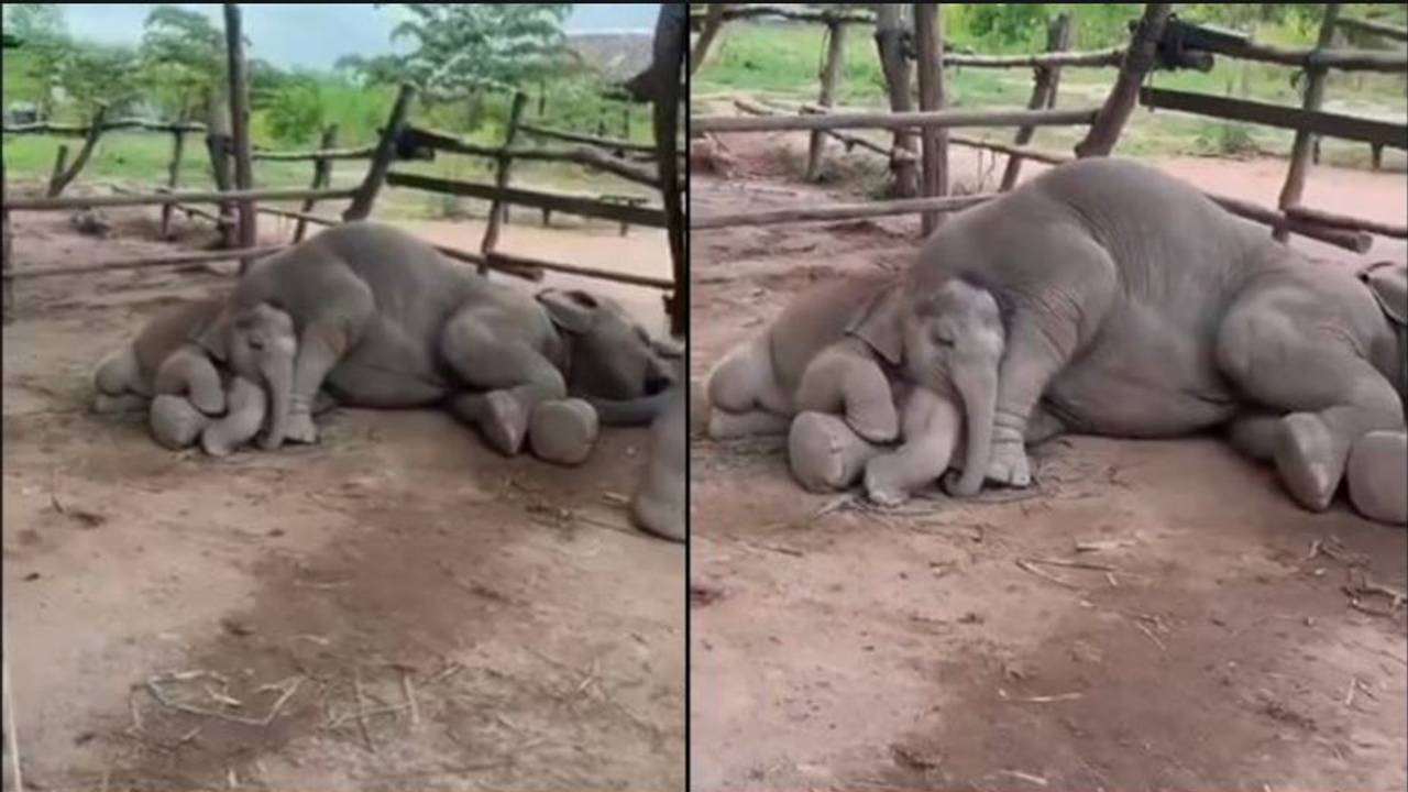 ಅಮ್ಮನ ಮಡಿಲು ಸ್ವರ್ಗಕ್ಕಿಂತಲೂ ಮಿಗಿಲು: ಅಮ್ಮನ ತೊಡೆ ಮೇಲೆಯೇ ನಿದ್ದೆಗೆ ಜಾರಿದ ಆನೆಮರಿ | Heartwarming Moment Elephant Calf Sleeps In Mothers Lap