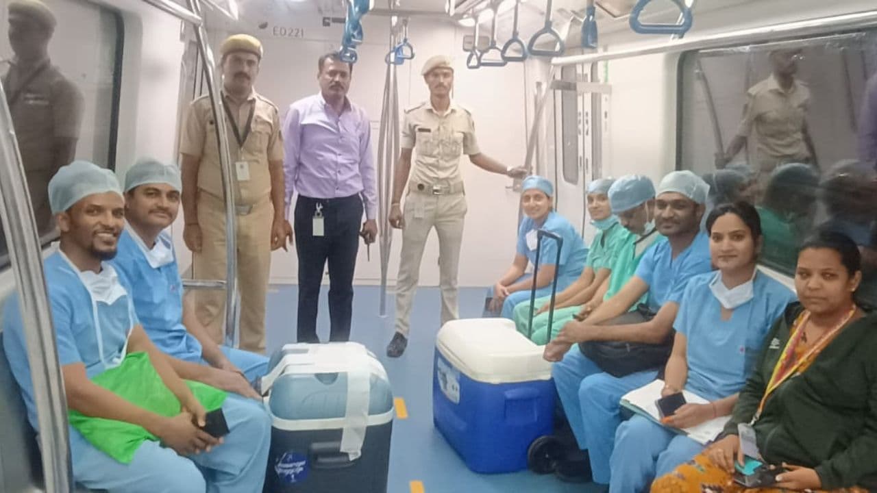 ಬೆಂಗಳೂರು (ಆ.02): ಪ್ರಥಮ ಬಾರಿಗೆ, ನಮ್ಮ ಮೆಟ್ರೋದಲ್ಲಿ ಮಾನವ ಯಕೃತ್ತನ್ನು ಶಸ್ತ್ರಚಿಕಿತ್ಸೆಗಾಗಿ ಸಾಗಿಸಲು ಸಹಕಾರ ನೀಡಿದೆ. ಶುಕ್ರವಾರ, ಆಗಸ್ಟ್ 1, 2025ರ ರಾತ್ರಿ 8:38ಕ್ಕೆ, ಯಕೃತ್ತನ್ನು ವೈದ್ಯರೊಬ್ಬರು ಮತ್ತು ಏಳು ಮಂದಿ ವೈದ್ಯಕೀಯ ಸಿಬ್ಬಂದಿಯೊಂದಿಗೆ ವೈದೇಹಿ ಆಸ್ಪತ್ರೆಯಿಂದ ವೈಟ್‌ಫೀಲ್ಡ್ ಮೆಟ್ರೋ ನಿಲ್ದಾಣಕ್ಕೆ ಆಂಬ್ಯುಲೆನ್ಸ್ ಮೂಲಕ ಸುರಕ್ಷಿತವಾಗಿ ಸಾಗಿಸಲಾಯಿತು. ಮೆಟ್ರೋ ನಿಲ್ದಾಣಕ್ಕೆ ತಲುಪಿದ ತಕ್ಷಣ, ಸಹಾಯಕ ಭದ್ರತಾ ಅಧಿಕಾರಿ (ASO) ಮತ್ತು ಮೆಟ್ರೋ ಸಿಬ್ಬಂದಿ ತಂಡವನ್ನು ಸ್ವೀಕರಿಸಿ, ದಾಖಲೆ ಕಾರ್ಯ ಮತ್ತು ಭದ್ರತಾ ಪರಿಶೀಲನೆಗಳನ್ನು ಸಂಯೋಜಿಸಿದರು.