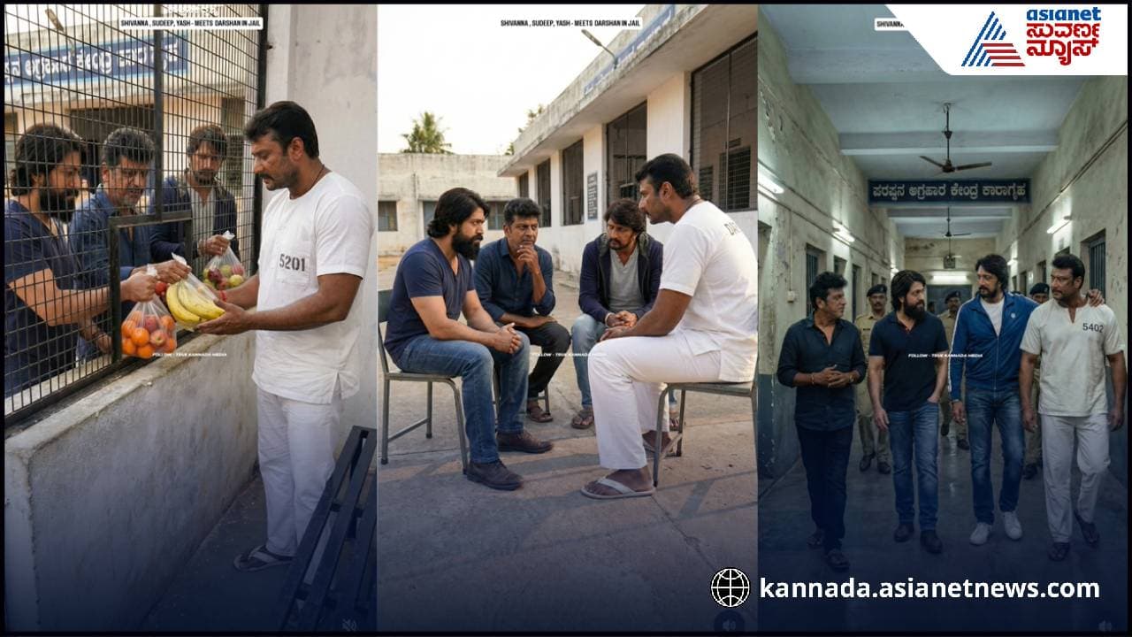 Darshan: ಪರಪ್ಪನ ಅಗ್ರಹಾರ ಜೈಲಲ್ಲಿರೊ ದರ್ಶನ್‌ಗೆ ಹಣ್ಣು ಕೊಟ್ಟ ಸುದೀಪ್, ಶಿವಣ್ಣ, ಯಶ್! | Sudeep Shiva Rajkumar Yash Meets Darshan In Jail Ai Video Goes Viral Bni