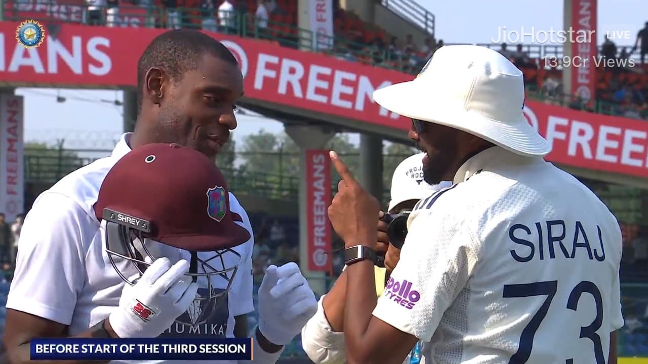 ಈ ನಡುವೆ, ಮೈದಾನದಲ್ಲಿ ನಡೆದ ಒಂದು ತಮಾಷೆಯ ಘಟನೆ ಸೋಷಿಯಲ್ ಮೀಡಿಯಾದಲ್ಲಿ ವೈರಲ್ ಆಗಿದೆ. ನಾಲ್ಕನೇ ದಿನ ಟೀ ವಿರಾಮಕ್ಕೂ ಮುನ್ನ ಒಂಬತ್ತು ವಿಕೆಟ್ ಕಳೆದುಕೊಂಡರೂ, ಗ್ರೀವ್ಸ್ ಮತ್ತು ಸೀಲ್ಸ್ ಭಾರತದ ಸುಲಭ ಗೆಲುವಿನ ನಿರೀಕ್ಷೆಯನ್ನು ಹುಸಿಗೊಳಿಸಿದರು. ಟೀ ವಿರಾಮದ ನಂತರ ಆಟಗಾರರು ಮೈದಾನಕ್ಕೆ ಇಳಿಯಲು ಸಿದ್ಧರಾಗಿದ್ದಾಗ, ವಿಂಡೀಸ್ ಆಟಗಾರ ಜಸ್ಟಿನ್ ಗ್ರೀವ್ಸ್ ಬಳಿ ತೆರಳಿದ ಸಿರಾಜ್, ಬೆರಳು ತೋರಿಸಿ ಮಾತನಾಡುತ್ತಿರುವುದು ಮತ್ತು ಗ್ರೀವ್ಸ್ ನಗುತ್ತಾ ನಿಂತಿರುವುದು ಕಂಡುಬಂತು. ತೆಲಂಗಾಣ ಪೊಲೀಸ್ನಲ್ಲಿ ಡಿಎಸ್ಪಿ ಆಗಿರುವ ಸಿರಾಜ್, ‘ಇನ್ನೂ ನಮ್ಮ ತಾಳ್ಮೆ ಪರೀಕ್ಷಿಸಬೇಡಿ’ ಎಂದು ತಮಾಷೆಯಾಗಿ ಗ್ರೀವ್ಸ್ಗೆ ಎಚ್ಚರಿಕೆ ನೀಡಿದ್ದಾರೆಂದು ಹೇಳಲಾಗುತ್ತಿದೆ.