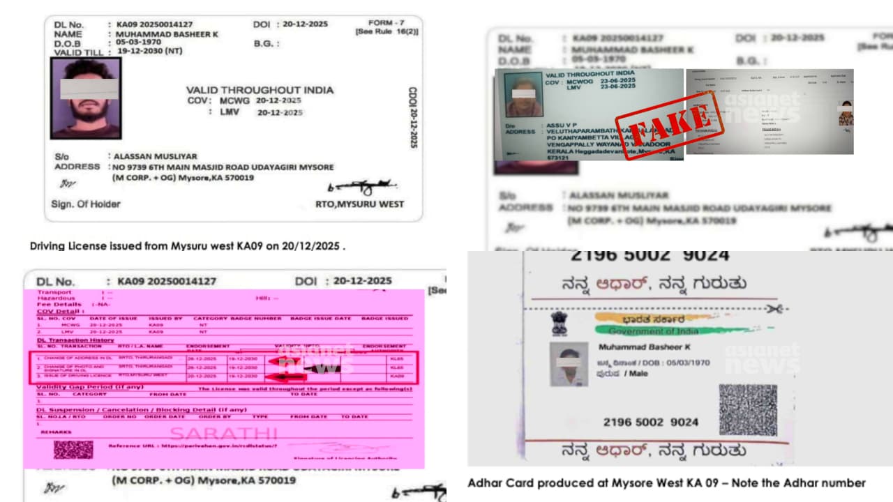 ನಂತರ ಡಿಸೆಂಬರ್ 28 ರಂದು ತಿರೂರಂಗಾಡಿಯಿಂದ ಮಲಪ್ಪುರಂ ವಿಳಾಸದಲ್ಲಿ ಹೊಸ ಫೋಟೋ ಮತ್ತು ಸಹಿಯೊಂದಿಗೆ ಹೊಸ ಡ್ರೈವಿಂಗ್ ಲೈಸೆನ್ಸ್ ನೀಡಲಾಗುತ್ತದೆ. ಇದೇ ಮೊಹಮ್ಮದ್ ಬಶೀರ್ ಲೈಸೆನ್ಸ್ಗಾಗಿ ಸಲ್ಲಿಸಿದ ಆಧಾರ್ ಕಾರ್ಡ್ಗಳು ಇವು. ಇಬ್ಬರು ವ್ಯಕ್ತಿಗಳ ಫೋಟೋಗಳಿರುವ ಮೈಸೂರು ಮತ್ತು ಮಲಪ್ಪುರಂ ವಿಳಾಸಗಳ ಆಧಾರ್ ಕಾರ್ಡ್ಗಳು ಪತ್ತೆಯಾಗಿವೆ. ಇದೇ ರೀತಿ ಹಲವು ವಂಚನೆಗಳು ನಡೆದಿವೆ. ಮೈಸೂರು ವಿಳಾಸದಲ್ಲಿ ಬೇರೆ ಫೋಟೋ ಇಟ್ಟು ಡ್ರೈವಿಂಗ್ ಲೈಸೆನ್ಸ್ ಪಡೆಯುತ್ತಾರೆ. ನಂತರ, ತಿರೂರಂಗಾಡಿಯಲ್ಲಿ ವಿಳಾಸ ಬದಲಾವಣೆ ಅರ್ಜಿಯ ನೆಪದಲ್ಲಿ ಫೋಟೋ, ವಿಳಾಸ, ಸಹಿ ಎಲ್ಲವನ್ನೂ ಬದಲಾಯಿಸಿ ಕೇರಳದ ವಿಳಾಸದಲ್ಲಿ ಹೊಸ ಲೈಸೆನ್ಸ್ ನೀಡಲಾಗುತ್ತದೆ.