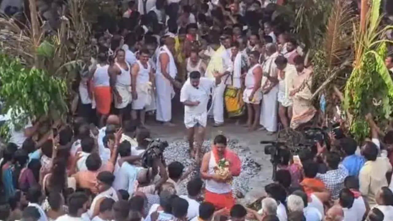 SS Mallikarjun: ದಾವಣಗೆರೆ ವೀರಭದ್ರೇಶ್ವರ ಜಾತ್ರೆ: ಪುತ್ರನ ಗೆಲುವಿಗಾಗಿ ಕೆಂಡ ಹಾಯ್ದ ಸಚಿವ ಮಲ್ಲಿಕಾರ್ಜುನ | Minister Ss Mallikarjun Walks On Hot Coals In Davanagere Veerabhadreshwar Jatre For Son S Victory Rav