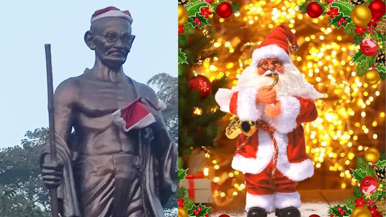 ಮಹಾತ್ಮ ಗಾಂಧಿ ಪ್ರತಿಮೆಗೆ ಸಾಂತಾ ಕ್ಲಾಸ್ ಟೋಪಿ ಹಾಕಿ ಅಪಮಾನ; ಕಿಡಗೇಡಿಗಳ ಕೃತ್ಯಕ್ಕೆ ಆಕ್ರೋಶ | Mahatma Gandhi Statue Insulted In Belagavi Santa Hat Placed On Statue Sat