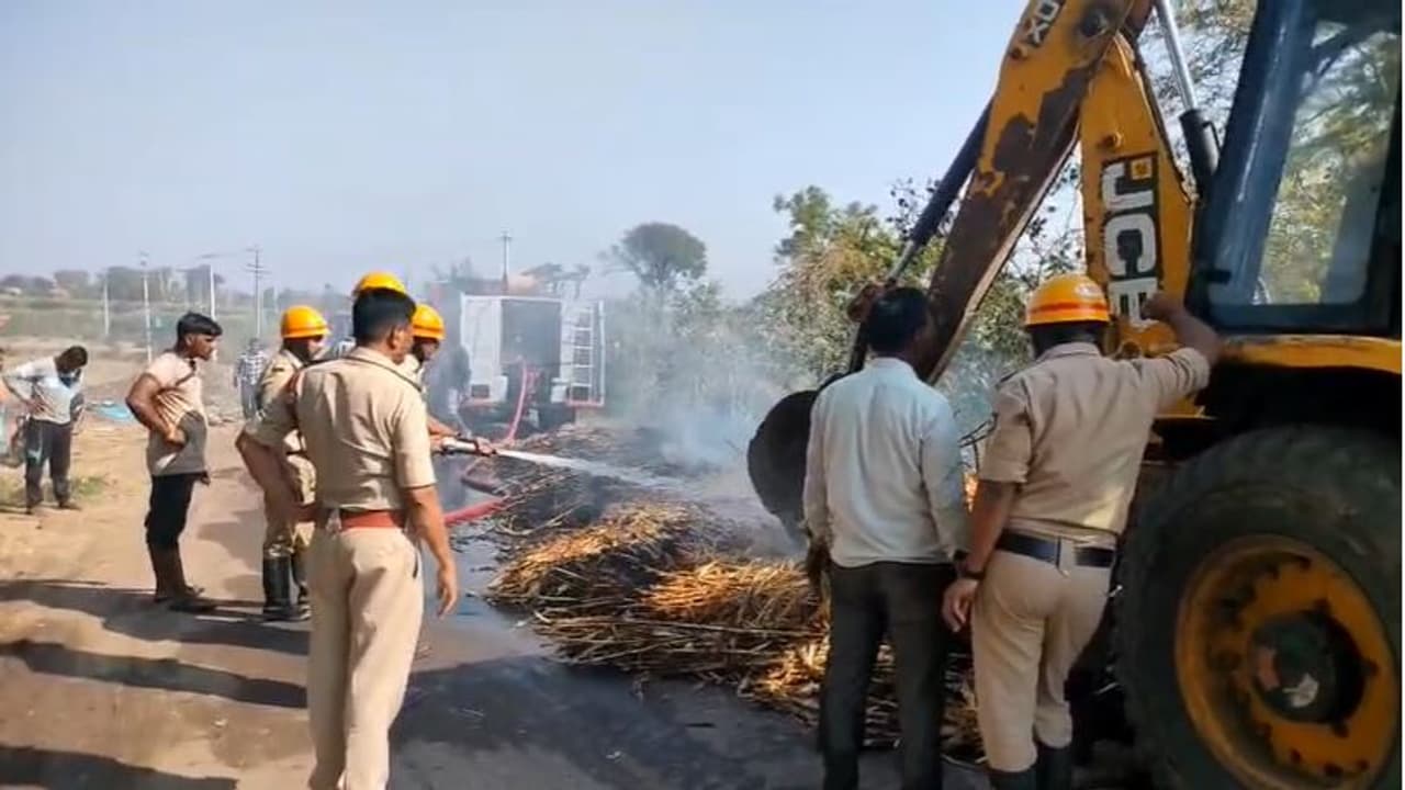 ಒಣ ಮೇವು ತುಂಬಿಕೊಂಡು ಹೋಗುತ್ತಿದ್ದ ಟ್ರಾಕ್ಟರ್ಗೆ ವಿದ್ಯುತ್ ತಂತಿ ಸ್ಪರ್ಶಿಸಿ ಬೆಂಕಿ