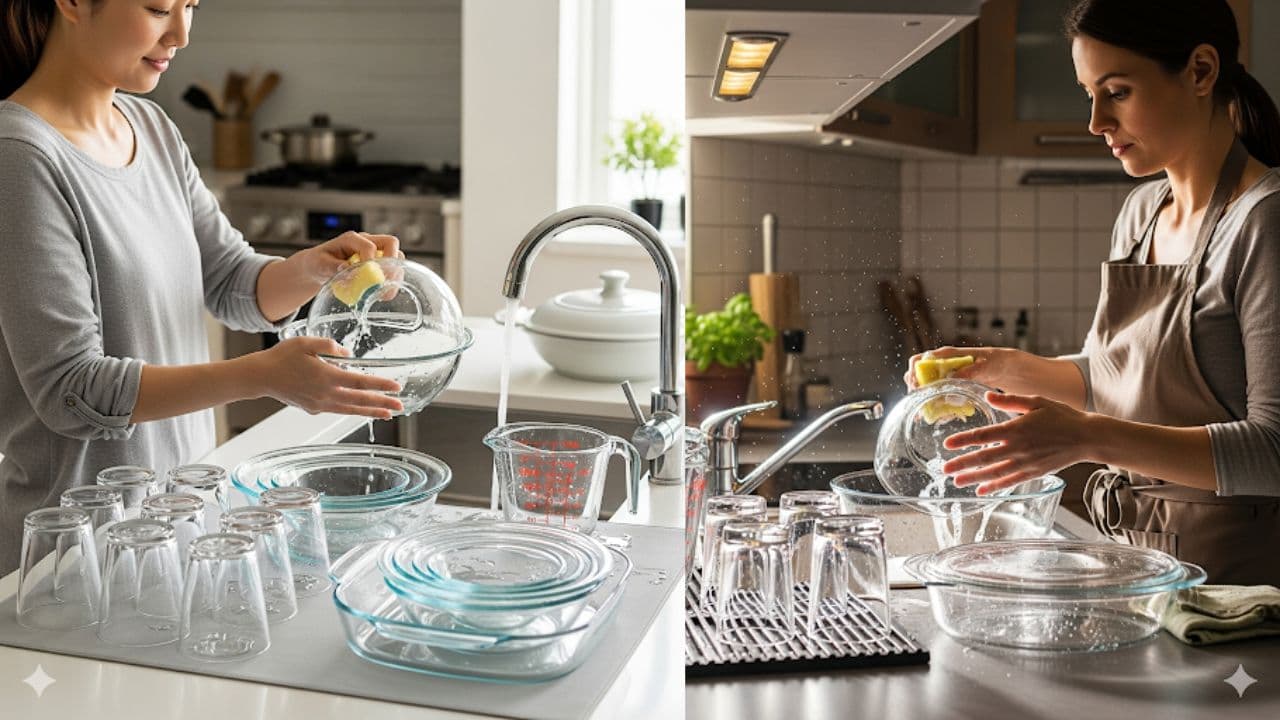 ಗಾಜಿನ ಬಾಟಲಿಗಳು ಮತ್ತು ಪಾತ್ರೆಗಳನ್ನು ಸ್ವಚ್ಛಗೊಳಿಸಲು ನೀವು ವಿನೆಗರ್ ಬಳಸಬಹುದು. ಇದಕ್ಕಾಗಿ, ಅರ್ಧ ಕಪ್ ವೈಟ್ ವಿನೆಗರ್ ಅನ್ನು ಉಗುರುಬೆಚ್ಚಗಿನ ನೀರಿನಲ್ಲಿ ಬೆರೆಸಿ, ಗಾಜಿನ ಪಾತ್ರೆಗಳನ್ನು ಅದರಲ್ಲಿ 15 ರಿಂದ 20 ನಿಮಿಷಗಳ ಕಾಲ ನೆನೆಸಿಡಿ. ನಂತರ ಬ್ರಷ್ನಿಂದ ನಿಧಾನವಾಗಿ ಉಜ್ಜಿ. ವಿನೆಗರ್ನಲ್ಲಿರುವ ಆಸಿಡ್, ಗಾಜಿನ ಪಾತ್ರೆಗಳ ಮೇಲಿನ ಕಲೆಗಳನ್ನು ಸುಲಭವಾಗಿ ತೆಗೆದುಹಾಕುತ್ತದೆ. ಪಾತ್ರೆಗಳು ಹೊಸದರಂತೆ ಹೊಳೆಯುತ್ತವೆ.