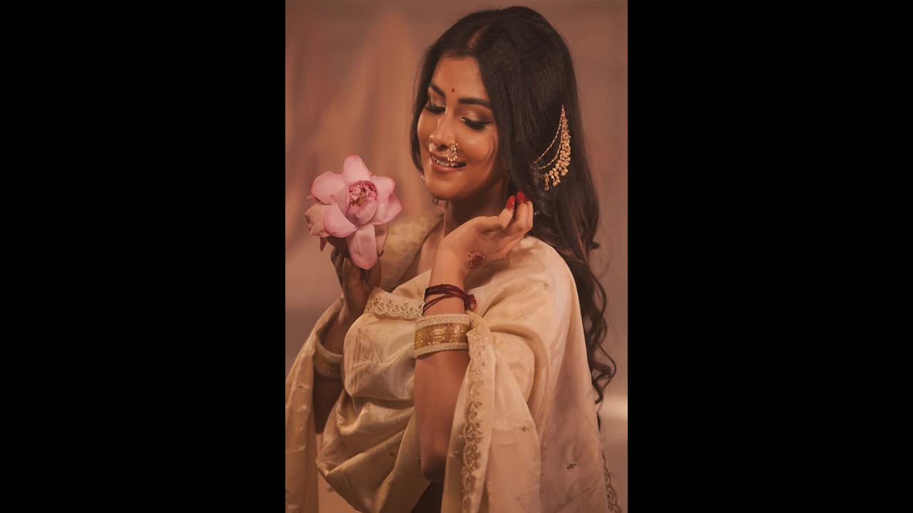 ತಿಳಿ ಬಣ್ಣದ ಸೀರೆಯುಟ್ಟು, ಕೈಯಲ್ಲಿ ತಾವರೆ ಹೂವು ಹಿಡಿದು ಮೂಗಿನಲ್ಲಿ ನತ್ತು, ಕಿವಿಯಲ್ಲಿ ಮಾಟಿ ಧರಿಸಿ ಥೇಟ್ ರವಿವರ್ಮದ ಕುಂಚದಲ್ಲಿ ಅರಳಿದ ಕಲಾಕೃತಿಯಂತೆ ಕಾಣಿಸಿಕೊಂಡಿದ್ದಾರೆ.