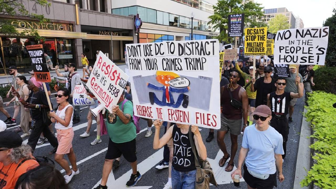 ವಾಷಿಂಗ್ಟನ್, ಆಗಸ್ಟ್ 17: ವಾಷಿಂಗ್ಟನ್ ಡಿಸಿಯ ಫೆಡರಲ್ ನಿಯಂತ್ರಣದಲ್ಲಿ ಇರಿಸುವುದಾಗಿ ಮತ್ತು 800 ನ್ಯಾಷನಲ್ ಗಾರ್ಡ್ಸ್ಗಳನ್ನು ಅಮೆರಿಕ ಅಧ್ಯಕ್ಷ ಡೊನಾಲ್ಡ್ ಘೋಷಿಸಿರುವುದು ಘೋಷಿಸಿರುವುದು ಮತ್ತೆ. ಶ್ವೇತಭವನದೆದುರು ಹಲವರು ಮೆರವಣಿಗೆ. ಸ್ಟೇಟ್ಸ್ ಸ್ಟೇಟ್ಸ್ ಗಾರ್ಡ್ ಎಂಬುದು ಸಶಸ್ತ್ರ.