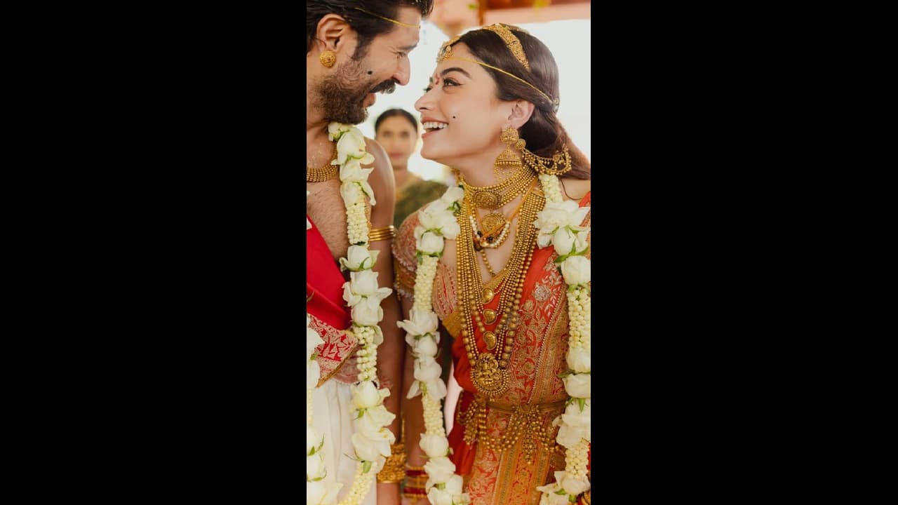 ರಶ್ಮಿಕಾ ಮಂದಣ್ಣ ಅವರ ಬ್ರೈಡಲ್ ಲುಕ್, ಸಾಂಪ್ರದಾಯಿಕ ದಕ್ಷಿಣ ಭಾರತದ ಆಭರಣಗಳಿಗೆ ಒಂದು ಪರ್ಫೆಕ್ಟ್ ಉದಾಹರಣೆ. ಭಾರೀ ಚಿನ್ನದ ಹಾರ, ಜುಮುಕಿ, ಮಾಂಗಟೀಕಾ ಮತ್ತು ಬಳೆಗಳ ಅದ್ಭುತ ಸಂಯೋಜನೆ ಅವರಿಗೆ ರಾಯಲ್, ಸೊಗಸಾದ ಮತ್ತು ಟೈಮ್ಲೆಸ್ ಲುಕ್ ನೀಡಿದೆ.